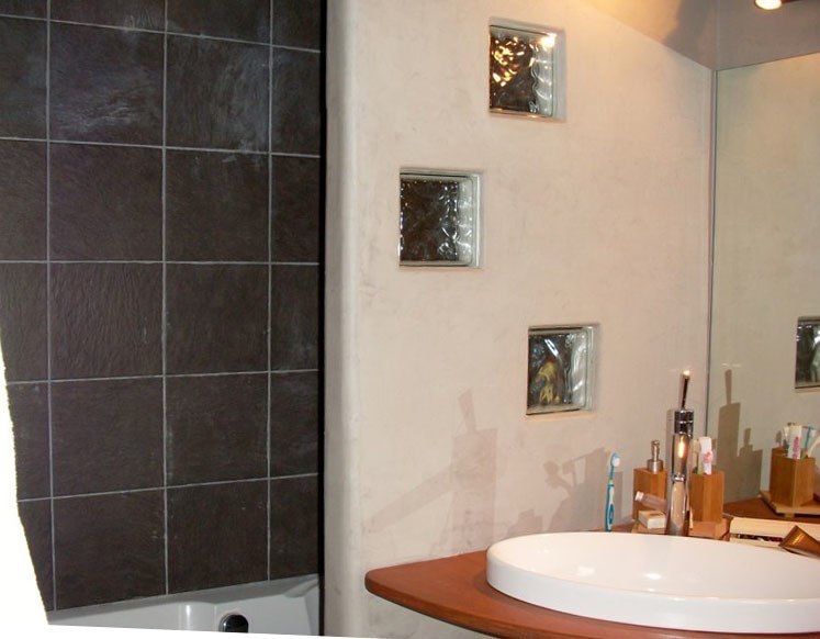 Faïence, galets et plan de vasque en béton ciré